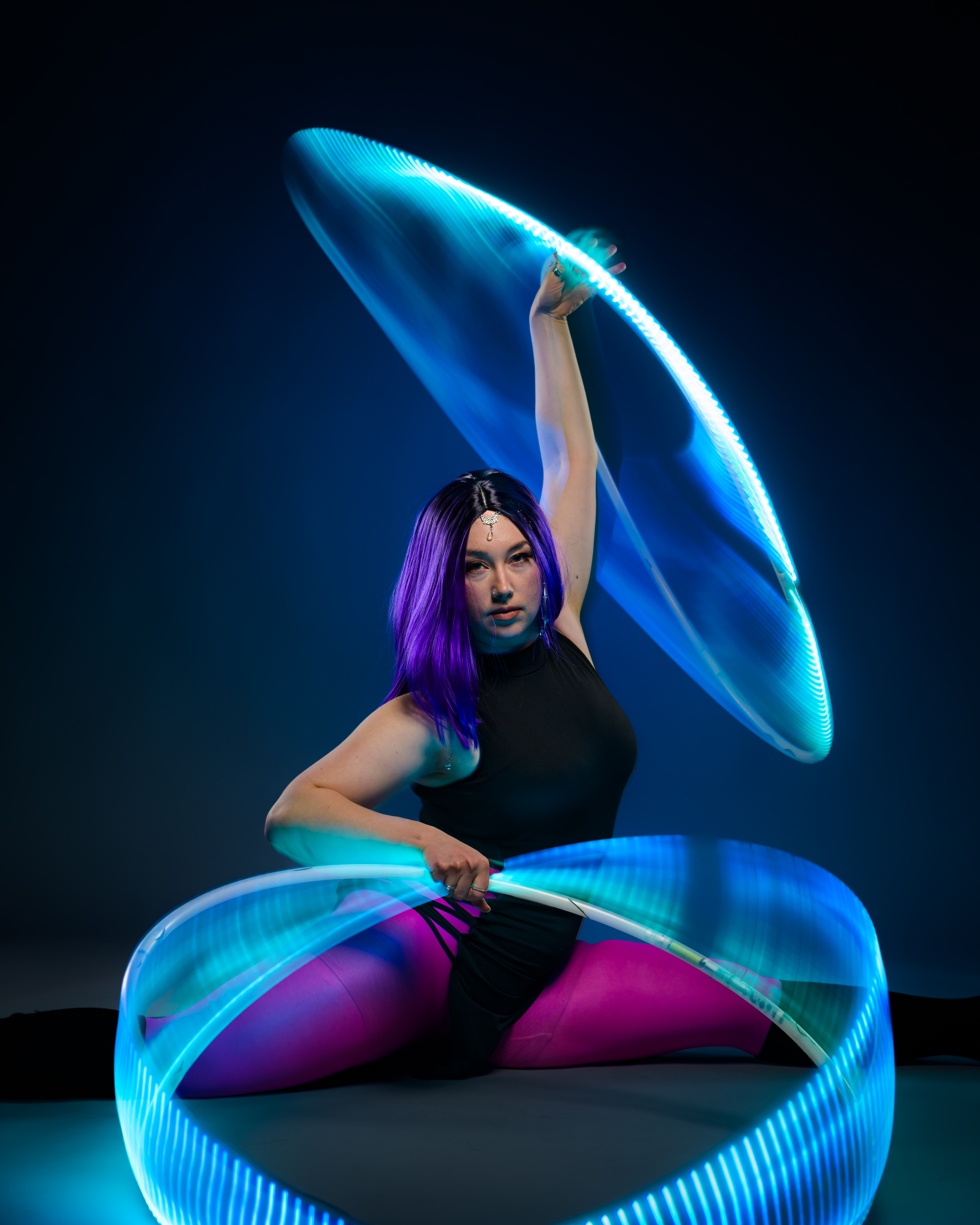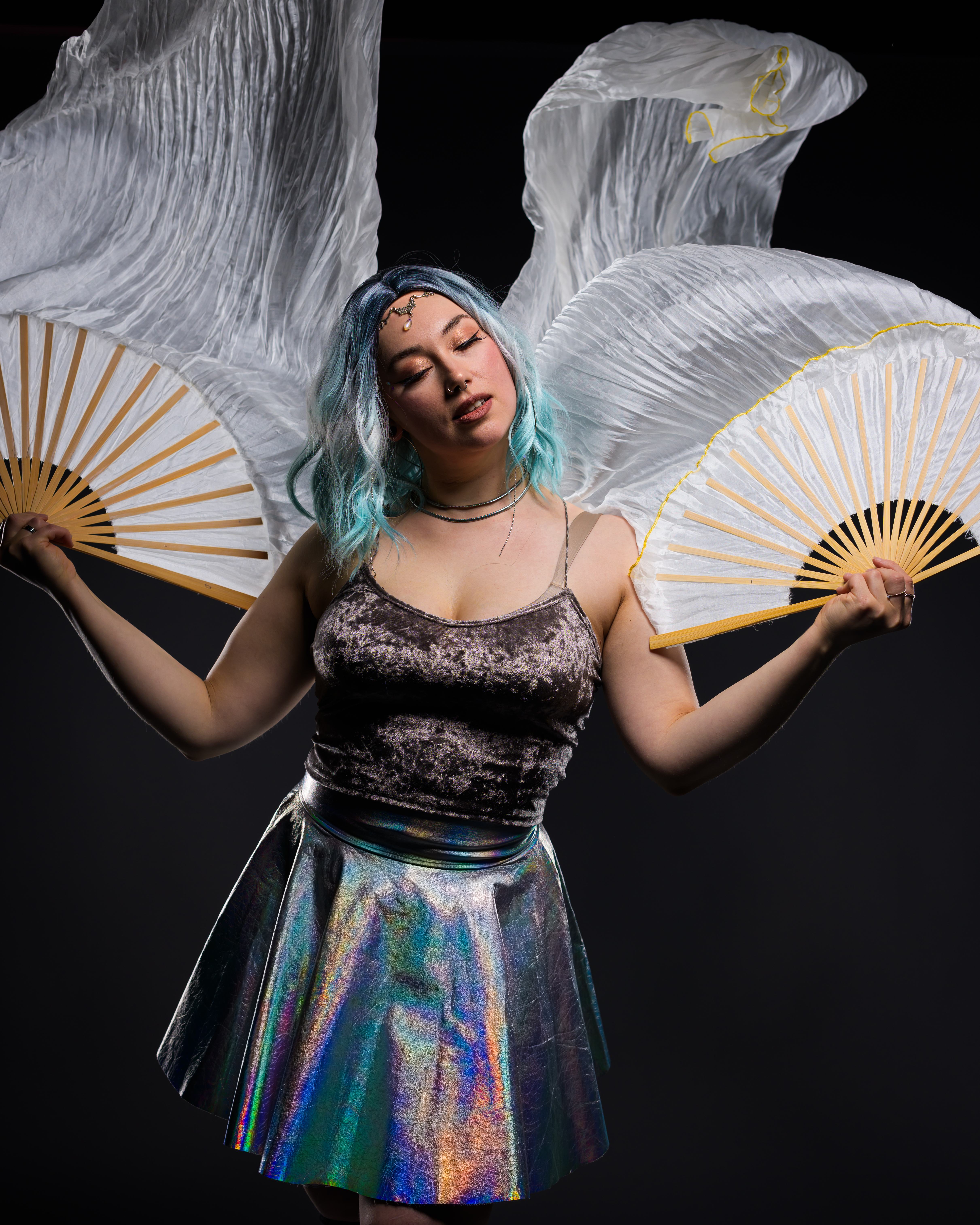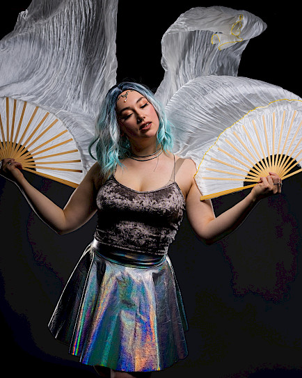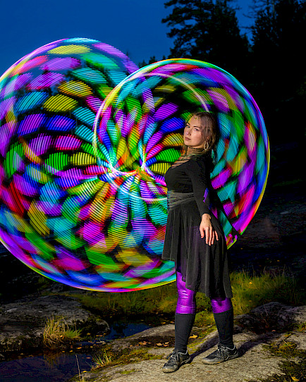 Duo in Lights – (12min, 2hlö) astu valon ja liikkeen taianomaiseen maailmaan! Tämä koreografioitu duo-esitys yhdistää silkkiviuhkojen kevyet ja elegantit liikkeet sekä LED-vanteiden valonloisteen, luoden visuaalisen shokeerauksen täynnä kauneutta ja draamaa. Esityksessä valo ja liike sulautuvat yhteen vieden katsojan lumoavalle matkalle. Anna itsesi tempautua valon pyörteisiin ja koe unohtumaton hetki, jossa tanssi ja valo kietoutuvat toisiinsa täydellisesti.