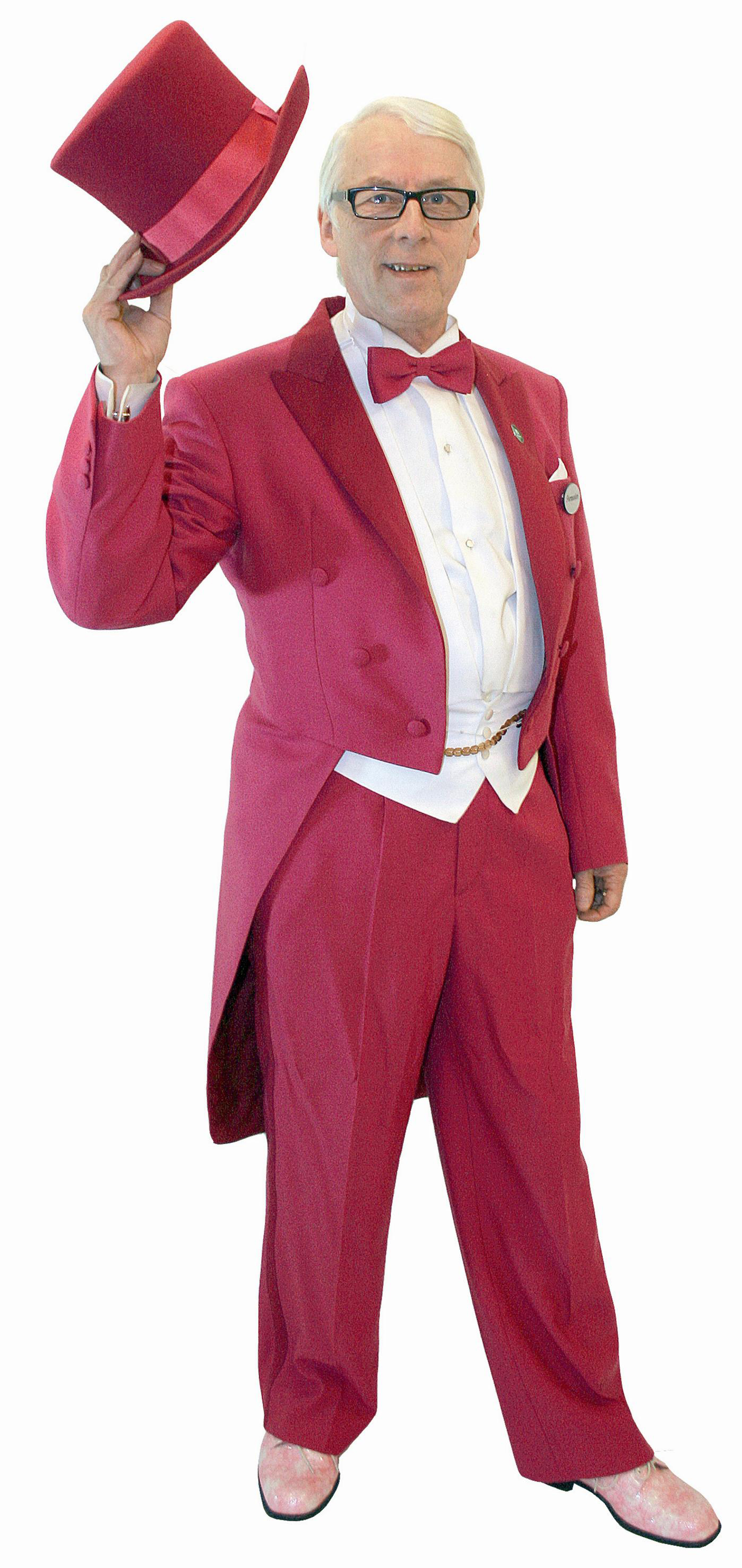 Frakki yllään asiakkaiden viihdyttäjänä Eero Lehtinen, joka on niin värikäs herra,